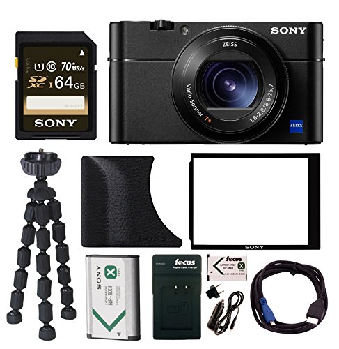 Introducing a new level of AF performance and speed to today's compact camera market. The RX100 V boasts the world's fastest AF speed1 (0.05 sec.), world's fastest continuous shooting speed (24fps) with world's most AF points1 315 for a compact camera. The RX100 V brings a new level of AF performance and speed to compact cameras. It is equipped with a fast hybrid autofocus system - the world's fastest - that combines the respective advantages of focal-plane phase detection AF and contrast detection AF that ultimately enables the camera to lock focus in as fast as 0.05 seconds. The pocket-size RX100 V features Clip 4K for short - up to 5 minute - 4K movie recording directly to SD memory cards - ideal for everyday casual use. High quality 4k is achieved by the 1" Exmor RS CMOS sensor with full pixel readout and no pixel binning - resulting in images that exhibit higher resolution and less moire and jaggies than typical 4K movies. Moreover, the XAVC S format is incorporated t o maximize high-bitrate shooting up to 100 Mbps for professional quality video. The focal plane phase detection AF system allows for fast hybrid AF during video and ensures accurate focusing and tracking performance, even for the severe focusing requirements of 4K movie shooting. AF drive speed and AF tracking sensitivity can also be adjusted via the menu system providing flexibility for focusing preferences. Bundle Includes: ⢠Sony DSC-RX100M5 Cyber-shot Digital Camera ⢠Sony AGR2 Attachment Grip (Black) ⢠Focus FC-BX1-105 1600mAh Rechargeable Lithium-Ion Replacement Battery Pack ⢠Focus Flexible 10" Spider Tripod ⢠HDMI Standard to Micro Cable ⢠Sony 1240mAh Li-Ion Rechargeable Battery Pack ⢠Sony LCD Protector for DSC-RX1 (Black) ⢠Sony 64GB 70MB/s Class 10 SDXC Memory Card